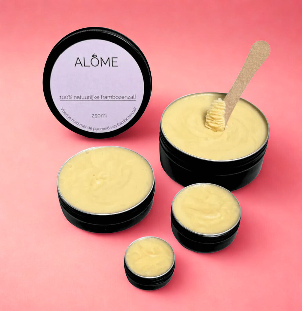 Frambozenzalf is rijk aan vitamine A, E en F, heeft kalmerende, hydraterende en ontstekingsremmende eigenschappen, die allemaal gunstig zijn voor je huid. Het helpt bij het verzachten van je huid en het bevorderen van genezing zoals bij luieruitslag, eczeem, acne, onzuiverheden, jeukende huid, muggenbulten en oppervlakkige snij- en schaafwonden.