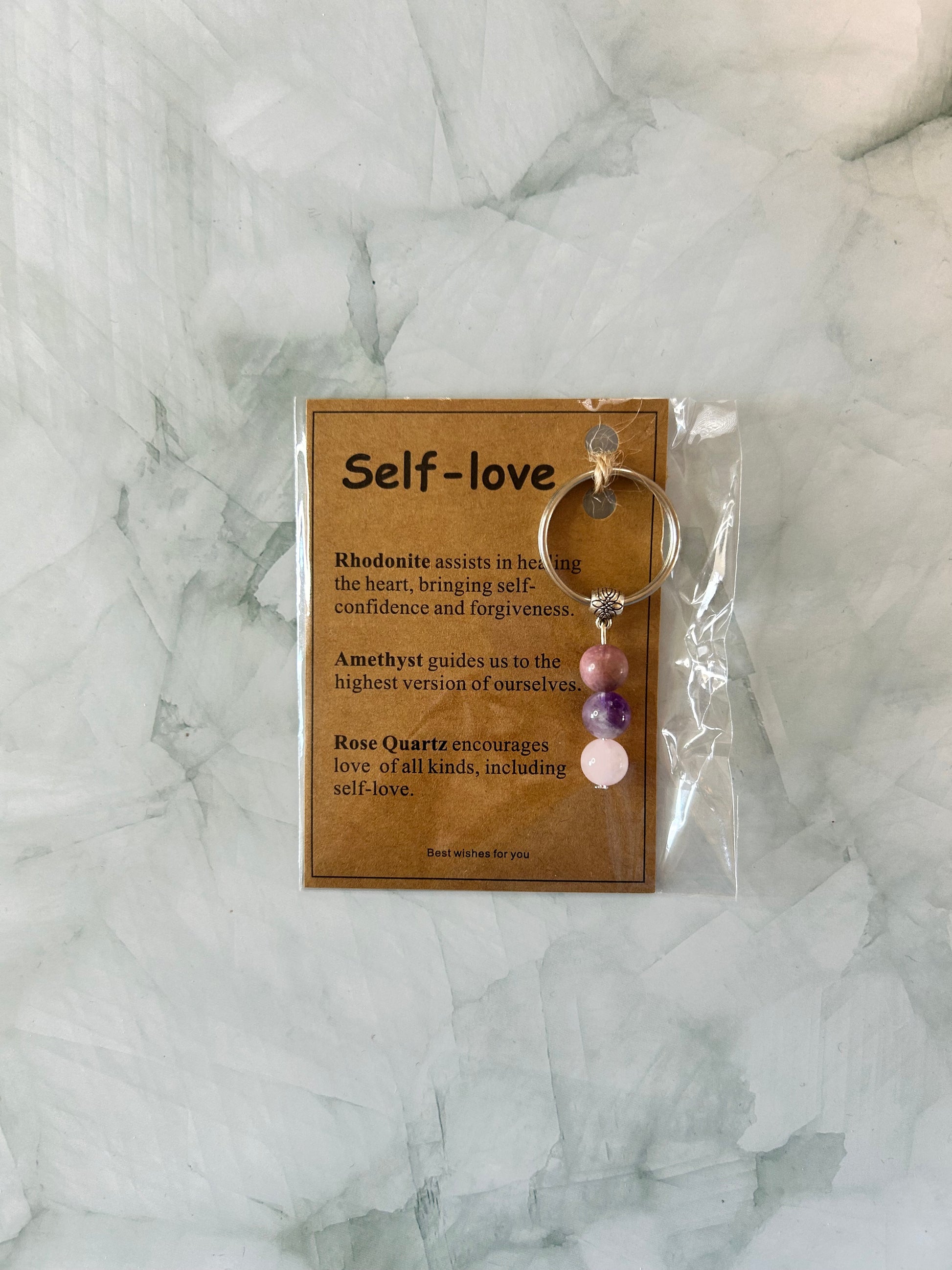 Elke sleutelhanger bevat drie unieke edelstenen, speciaal gekozen om hun eigenschappen die aangesloten bij jouw gekozen thema.
